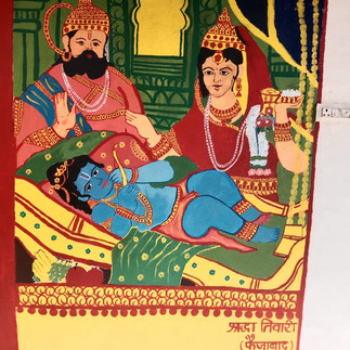 संजय नागर ने स्वागतातुर स्त्री को फड़ शैली में बनाया है । यह स्त्री रामदरबार में पहूंचने वाले सभी का आरती के ,साथ स्वागत कर रही है।